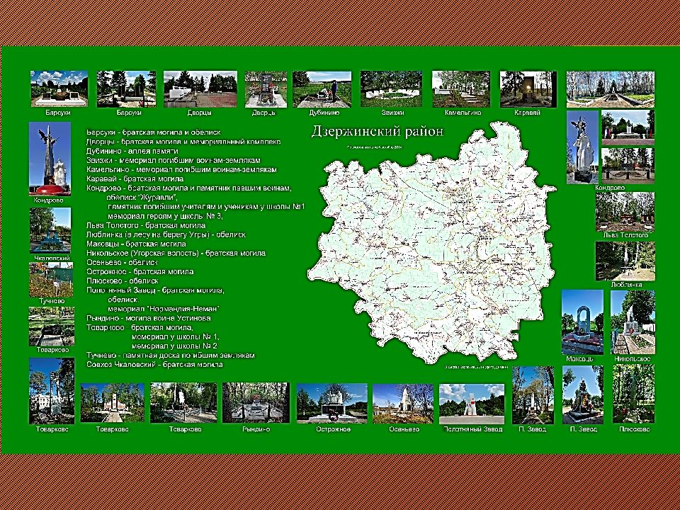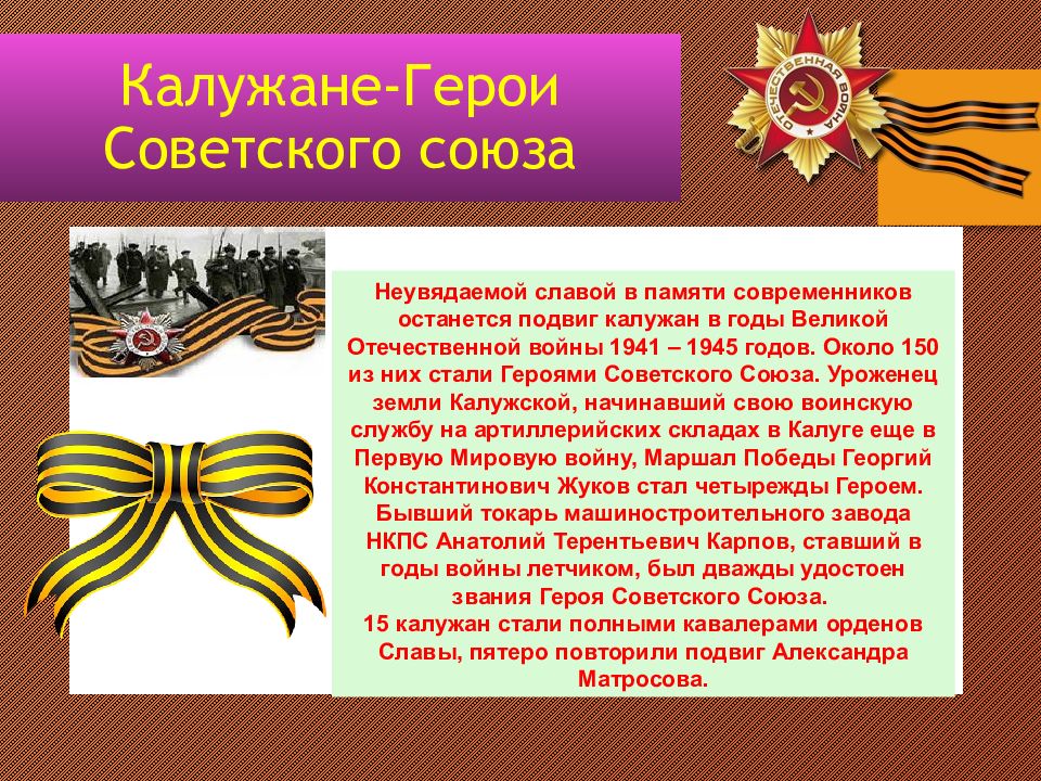 Неувядаемой славой в памяти современников останется подвиг калужан в годы Великой Отечественной войны 1941 – 1945 годов. Около 150 из них стали Героями Советского Союза. Уроженец земли Калужской, начинавший свою воинскую службу на артиллерийских складах в Калуге еще в Первую Мировую войну, Маршал Победы Георгий Константинович Жуков стал четырежды Героем. Бывший токарь машиностроительного завода НКПС Анатолий Терентьевич Карпов, ставший в годы войны летчиком, был дважды удостоен звания Героя Советского Союза. 15 калужан стали полными кавалерами орденов Славы, пятеро повторили подвиг Александра Матросова.