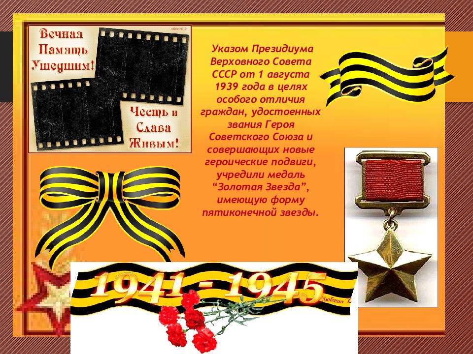 Указом Президиума Верховного Совета СССР от 1 августа 1939 года в целях особого отличия граждан, удостоенных звания Героя Советского Союза и совершающих новые героические подвиги, учредили медаль “Золотая Звезда”, имеющую форму пятиконечной звезды.