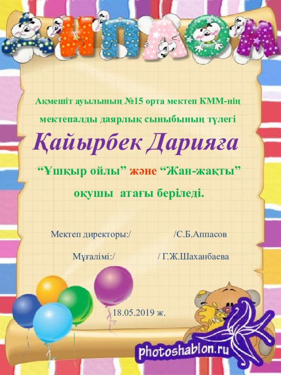 Ақмешіт ауылының №15 орта мектеп КММ-нің мектепалды даярлық сыныбының түлегі Қайырбек Дарияға “Ұшқыр ойлы” және “Жан-жақты” оқушы атағы беріледі. Мектеп директоры:/ /С.Б.Аппасов Мұғалімі:/ / Г.Ж.Шаханбаева 18.05.2019 ж.