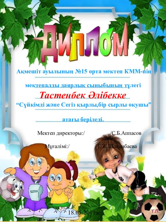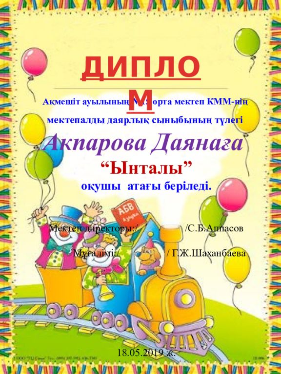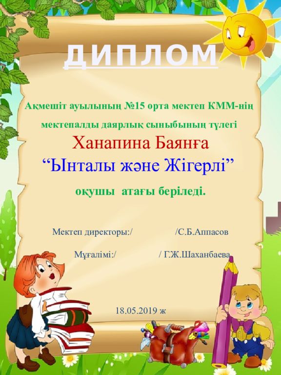Ақмешіт ауылының №15 орта мектеп КММ-нің мектепалды даярлық сыныбының түлегі Акпарова Даянаға “Ұшқыр ойлы” және “Жан-жақты” оқушы атағы беріледі. Мектеп директоры:/ /С.Б.Аппасов Мұғалімі:/ / Г.Ж.Шаханбаева 18.05.2019 ж Ақмешіт ауылының №15 орта мектеп КММ-нің мектепалды даярлық сыныбының түлегі Акпарова Даянаға “Ынталы” оқушы атағы беріледі. Мектеп директоры:/ /С.Б.Аппасов Мұғалімі:/ / Г.Ж.Шаханбаева 18.05.2019 ж. ДИПЛОМ