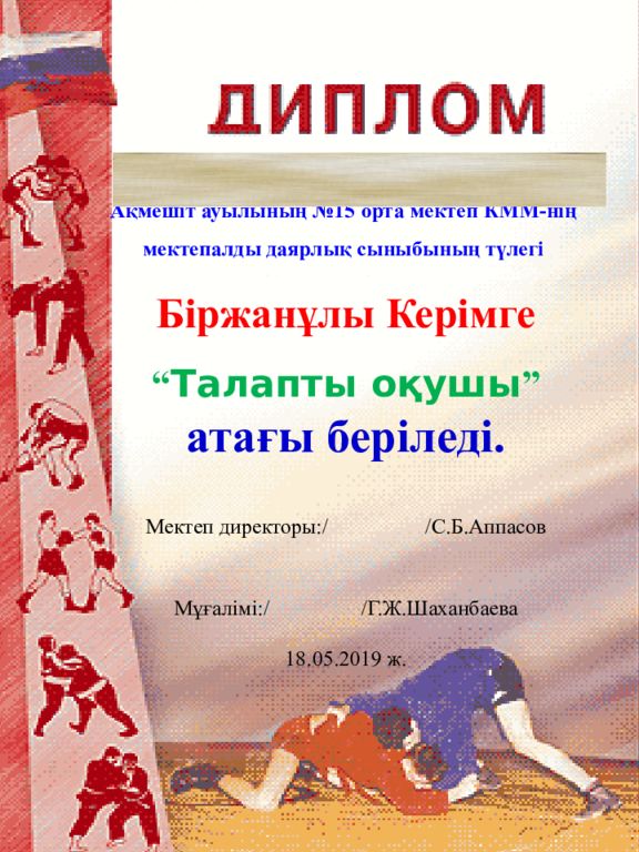 Ақмешіт ауылының №15 орта мектеп КММ-нің мектепалды даярлық сыныбының түлегі Біржанұлы Керімге “ Талапты оқушы ” атағы беріледі. Мектеп директоры:/ /С.Б.Аппасов Мұғалімі:/ /Г.Ж.Шаханбаева 18.05.2019 ж.