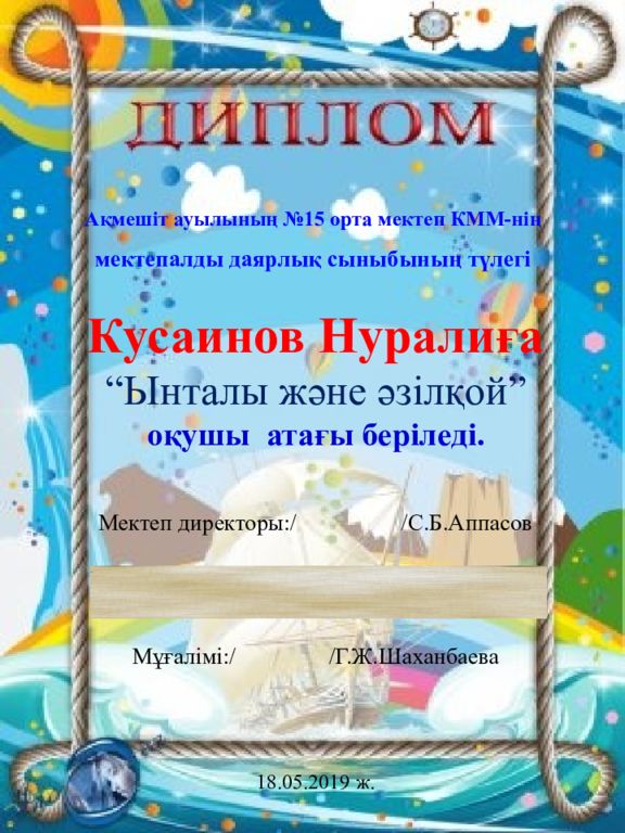 Ақмешіт ауылының №15 орта мектеп КММ-нің мектепалды даярлық сыныбының түлегі Кусаинов Нуралиға “Ынталы және әзілқой” оқушы атағы беріледі. Мектеп директоры:/ /С.Б.Аппасов Мұғалімі:/ /Г.Ж.Шаханбаева 18.05.2019 ж.