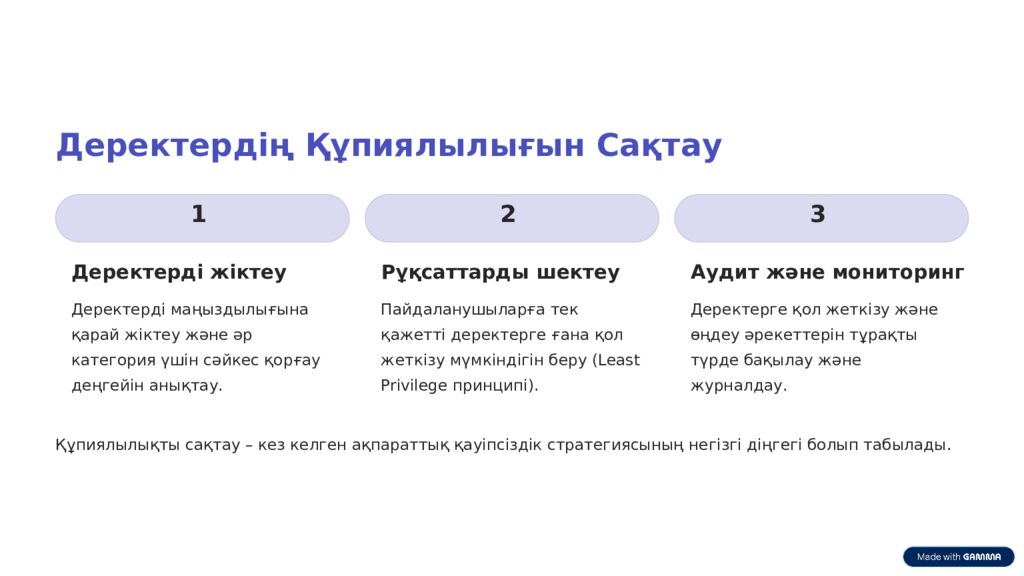 Деректердің Құпиялылығын Сақтау 1 Деректерді жіктеу Деректерді маңыздылығына қарай жіктеу және әр категория үшін сәйкес қорғау деңгейін анықтау. 2 Рұқсаттарды шектеу Пайдаланушыларға тек қажетті деректерге ғана қол жеткізу мүмкіндігін беру (Least Privilege принципі). 3 Аудит және мониторинг Деректерге қол жеткізу және өңдеу әрекеттерін тұрақты түрде бақылау және журналдау. Құпиялылықты сақтау – кез келген ақпараттық қауіпсіздік стратегиясының негізгі діңгегі болып табылады.
