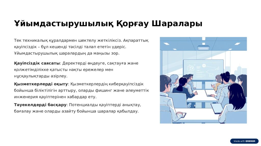 Ұйымдастырушылық Қорғау Шаралары Тек техникалық құралдармен шектелу жеткіліксіз. Ақпараттық қауіпсіздік – бұл кешенді тәсілді талап ететін үдеріс. Ұйымдастырушылық шаралардың да маңызы зор. Қауіпсіздік саясаты : Деректерді өңдеуге, сақтауға және қолжетімділікке қатысты нақты ережелер мен нұсқаулықтарды әзірлеу. Қызметкерлерді оқыту : Қызметкерлердің киберқауіпсіздік бойынша біліктілігін арттыру, оларды фишинг және әлеуметтік инженерия қауіптерінен хабардар ету. Тәуекелдерді басқару : Потенциалды қауіптерді анықтау, бағалау және оларды азайту бойынша шаралар қабылдау.