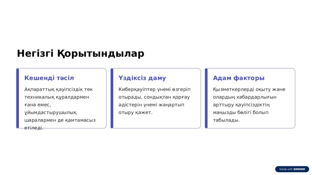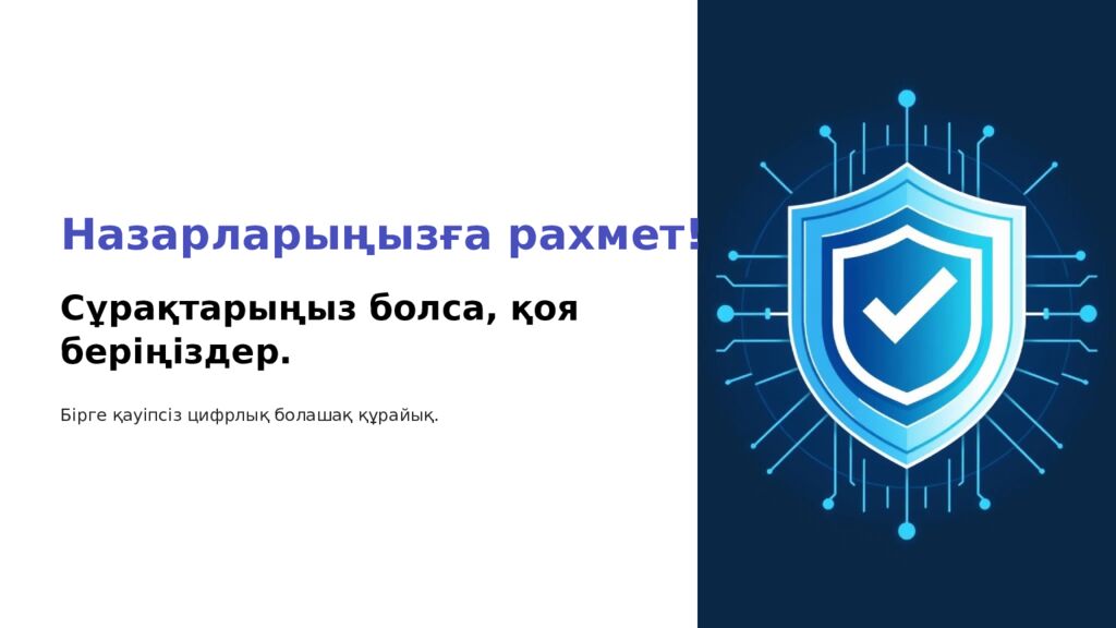 Негізгі Қорытындылар Кешенді тәсіл Ақпараттық қауіпсіздік тек техникалық құралдармен ғана емес, ұйымдастырушылық шаралармен де қамтамасыз етіледі. Үздіксіз даму Киберқауіптер үнемі өзгеріп отырады, сондықтан қорғау әдістерін үнемі жаңартып отыру қажет. Адам факторы Қызметкерлерді оқыту және олардың хабардарлығын арттыру қауіпсіздіктің маңызды бөлігі болып табылады.