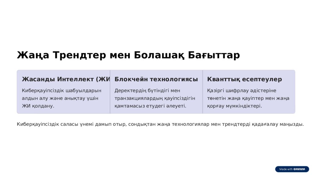 Жаңа Трендтер мен Болашақ Бағыттар Жасанды Интеллект (ЖИ) Киберқауіпсіздік шабуылдарын алдын алу және анықтау үшін ЖИ қолдану. Блокчейн технологиясы Деректердің бүтіндігі мен транзакциялардың қауіпсіздігін қамтамасыз етудегі әлеуеті. Кванттық есептеулер Қазіргі шифрлау әдістеріне төнетін жаңа қауіптер мен жаңа қорғау мүмкіндіктері. Киберқауіпсіздік саласы үнемі дамып отыр, сондықтан жаңа технологиялар мен трендтерді қадағалау маңызды.