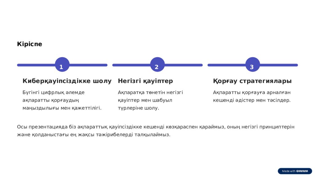 Кіріспе 1 Киберқауіпсіздікке шолу Бүгінгі цифрлық әлемде ақпаратты қорғаудың маңыздылығы мен қажеттілігі. 2 Негізгі қауіптер Ақпаратқа төнетін негізгі қауіптер мен шабуыл түрлеріне шолу. 3 Қорғау стратегиялары Ақпаратты қорғауға арналған кешенді әдістер мен тәсілдер. Осы презентацияда біз ақпараттық қауіпсіздікке кешенді көзқараспен қараймыз, оның негізгі принциптерін және қолданыстағы ең жақсы тәжірибелерді талқылаймыз.
