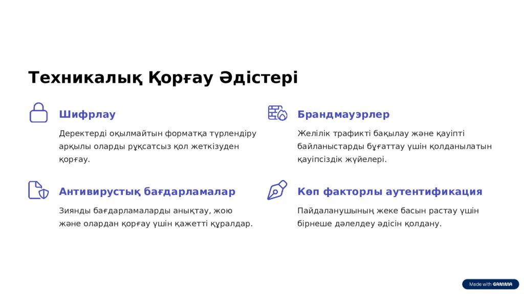 Техникалық Қорғау Әдістері Шифрлау Деректерді оқылмайтын форматқа түрлендіру арқылы оларды рұқсатсыз қол жеткізуден қорғау. Брандмауэрлер Желілік трафикті бақылау және қауіпті байланыстарды бұғаттау үшін қолданылатын қауіпсіздік жүйелері. Антивирустық бағдарламалар Зиянды бағдарламаларды анықтау, жою және олардан қорғау үшін қажетті құралдар. Көп факторлы аутентификация Пайдаланушының жеке басын растау үшін бірнеше дәлелдеу әдісін қолдану.