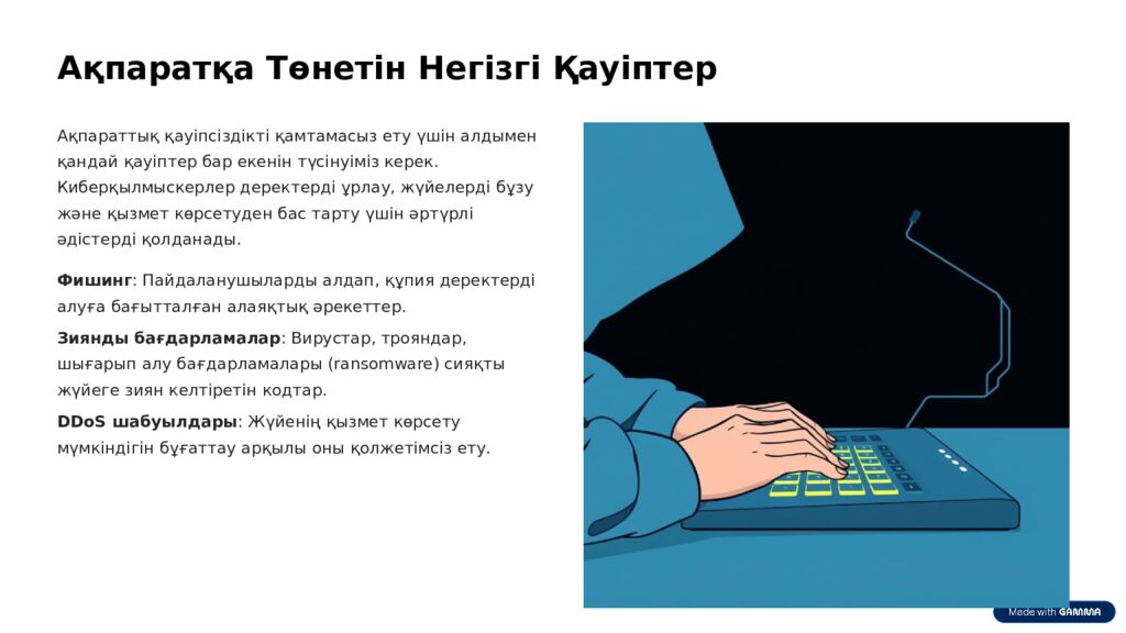 Ақпаратқа Төнетін Негізгі Қауіптер Ақпараттық қауіпсіздікті қамтамасыз ету үшін алдымен қандай қауіптер бар екенін түсінуіміз керек. Киберқылмыскерлер деректерді ұрлау, жүйелерді бұзу және қызмет көрсетуден бас тарту үшін әртүрлі әдістерді қолданады. Фишинг : Пайдаланушыларды алдап, құпия деректерді алуға бағытталған алаяқтық әрекеттер. Зиянды бағдарламалар : Вирустар, трояндар, шығарып алу бағдарламалары (ransomware) сияқты жүйеге зиян келтіретін кодтар. DDoS шабуылдары : Жүйенің қызмет көрсету мүмкіндігін бұғаттау арқылы оны қолжетімсіз ету.