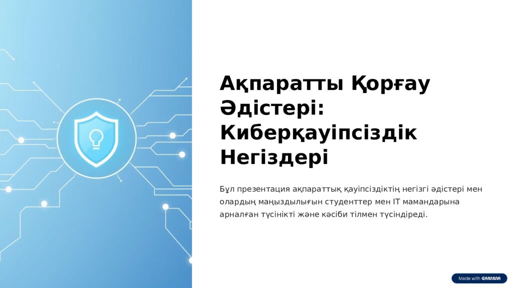 Ақпаратты Қорғау Әдістері: Киберқауіпсіздік Негіздері Бұл презентация ақпараттық қауіпсіздіктің негізгі әдістері мен олардың маңыздылығын студенттер мен ІТ мамандарына арналған түсінікті және кәсіби тілмен түсіндіреді.