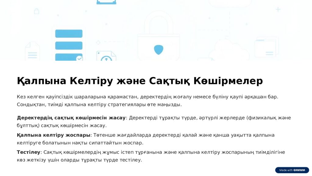 Қалпына Келтіру және Сақтық Көшірмелер Кез келген қауіпсіздік шараларына қарамастан, деректердің жоғалу немесе бүліну қаупі әрқашан бар. Сондықтан, тиімді қалпына келтіру стратегиялары өте маңызды. Деректердің сақтық көшірмесін жасау : Деректерді тұрақты түрде, әртүрлі жерлерде (физикалық және бұлттық) сақтық көшірмесін жасау. Қалпына келтіру жоспары : Төтенше жағдайларда деректерді қалай және қанша уақытта қалпына келтіруге болатынын нақты сипаттайтын жоспар. Тестілеу : Сақтық көшірмелердің жұмыс істеп тұрғанына және қалпына келтіру жоспарының тиімділігіне көз жеткізу үшін оларды тұрақты түрде тестілеу.