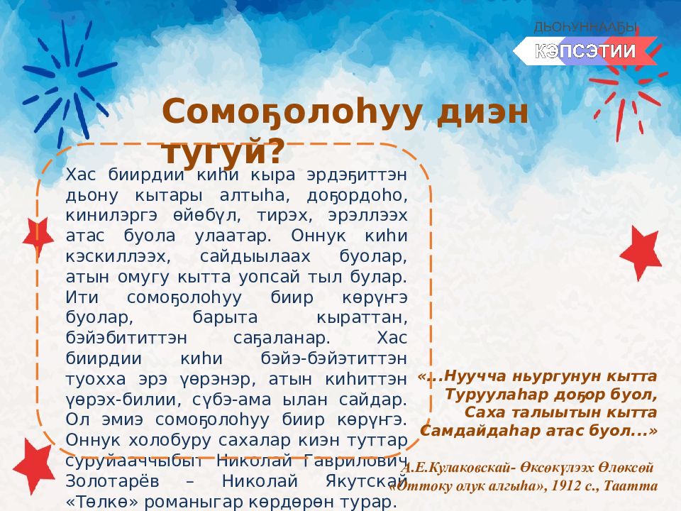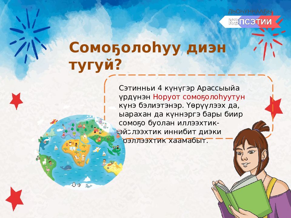 Сэтинньи 4 күнүгэр Арассыыйа үрдүнэн Норуот сомоҕолоһуутун күнэ бэлиэтэнэр. Үөрүүлээх да, ыарахан да күннэргэ бары биир сомоҕо буолан иллээхтик-эйэлээхтик иннибит диэки эрэллээхтик хаамабыт. Сомоҕолоһуу диэн тугуй ?