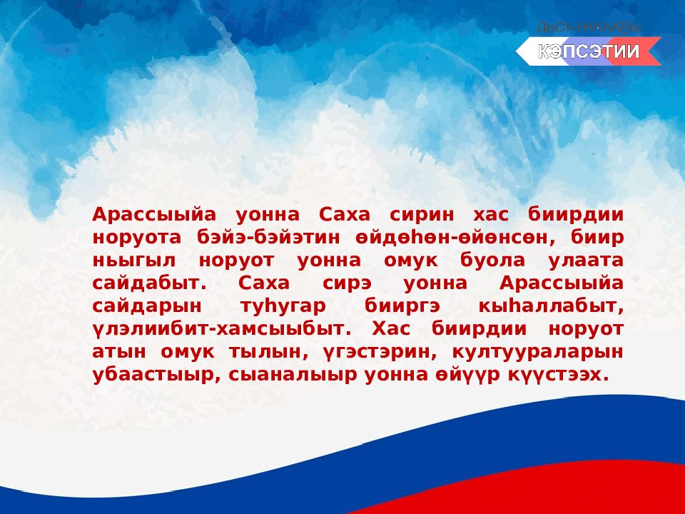 Арассыыйа уонна Саха сирин хас биирдии норуота бэйэ-бэйэтин өйдөһөн-өйөнсөн, биир ньыгыл норуот уонна омук буола улаата сайдабыт. Саха сирэ уонна Арассыыйа сайдарын туһугар бииргэ кыһаллабыт, үлэлиибит-хамсыыбыт. Хас биирдии норуот атын омук тылын, үгэстэрин, култуураларын убаастыыр, сыаналыыр уонна өйүүр күүстээх.