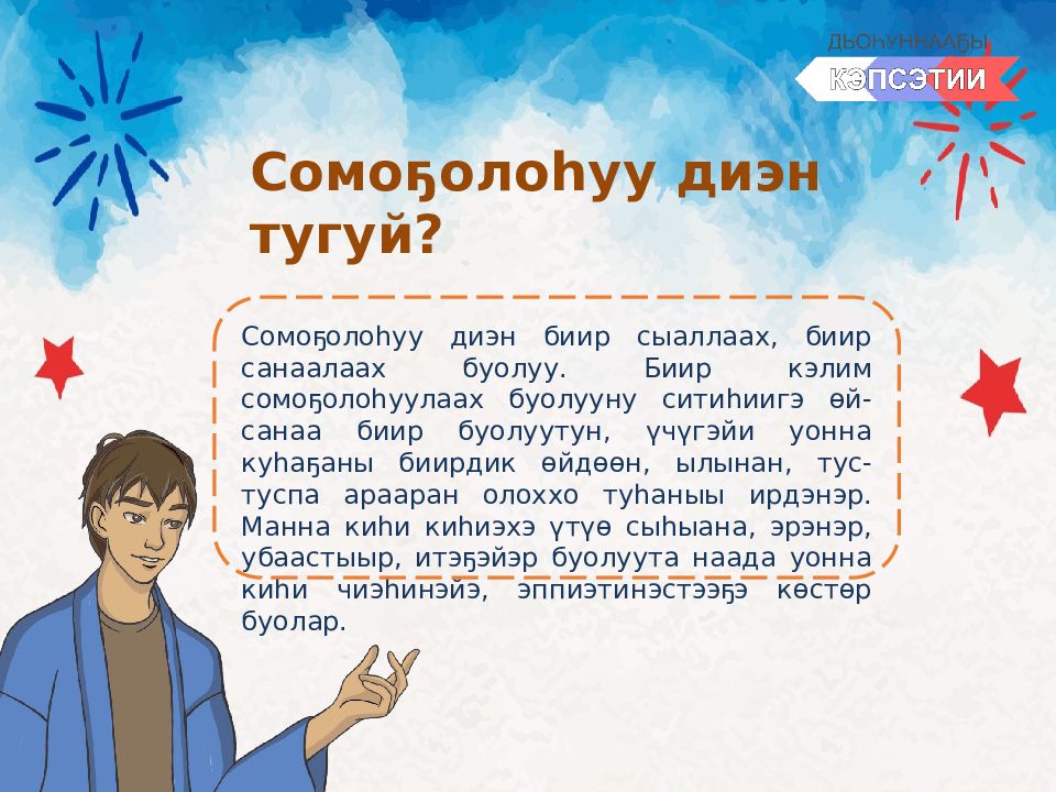 Сомоҕолоһуу диэн биир сыаллаах, биир санаалаах буолуу. Биир кэлим сомоҕолоһуулаах буолууну ситиһиигэ өй-санаа биир буолуутун, үчүгэйи уонна куһаҕаны биирдик өйдөөн, ылынан, тус-туспа арааран олоххо туһаныы ирдэнэр. Манна киһи киһиэхэ үтүө сыһыана, эрэнэр, убаастыыр, итэҕэйэр буолуута наада уонна киһи чиэһинэйэ, эппиэтинэстээҕэ көстөр буолар. Сомоҕолоһуу диэн тугуй ?