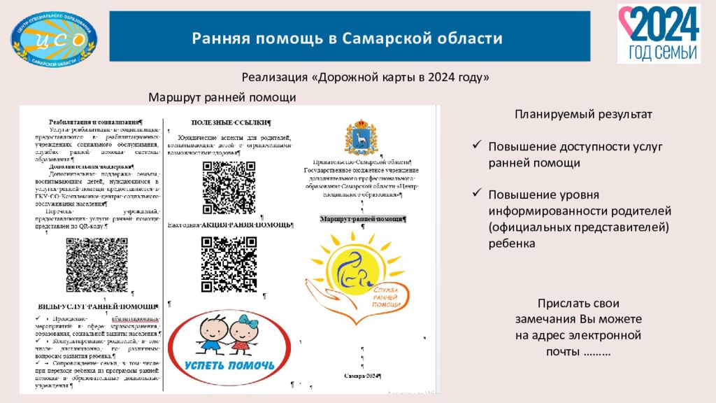 Ранняя помощь в Самарской области Реализация «Дорожной карты в 2024 году» Планируемый результат Повышение доступности услуг ранней помощи Повышение уровня информированности родителей (официальных представителей) ребенка Маршрут ранней помощи Прислать свои замечания Вы можете на адрес электронной почты ………