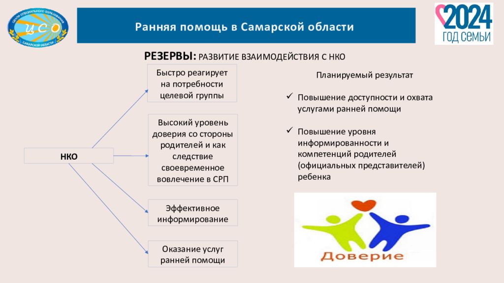 Ранняя помощь в Самарской области РЕЗЕРВЫ : РАЗВИТИЕ ВЗАИМОДЕЙСТВИЯ С НКО Планируемый результат Повышение доступности и охвата услугами ранней помощи Повышение уровня информированности и компетенций родителей (официальных представителей) ребенка НКО Быстро реагирует на потребности целевой группы Высокий уровень доверия со стороны родителей и как следствие своевременное вовлечение в СРП Эффективное информирование Оказание услуг ранней помощи