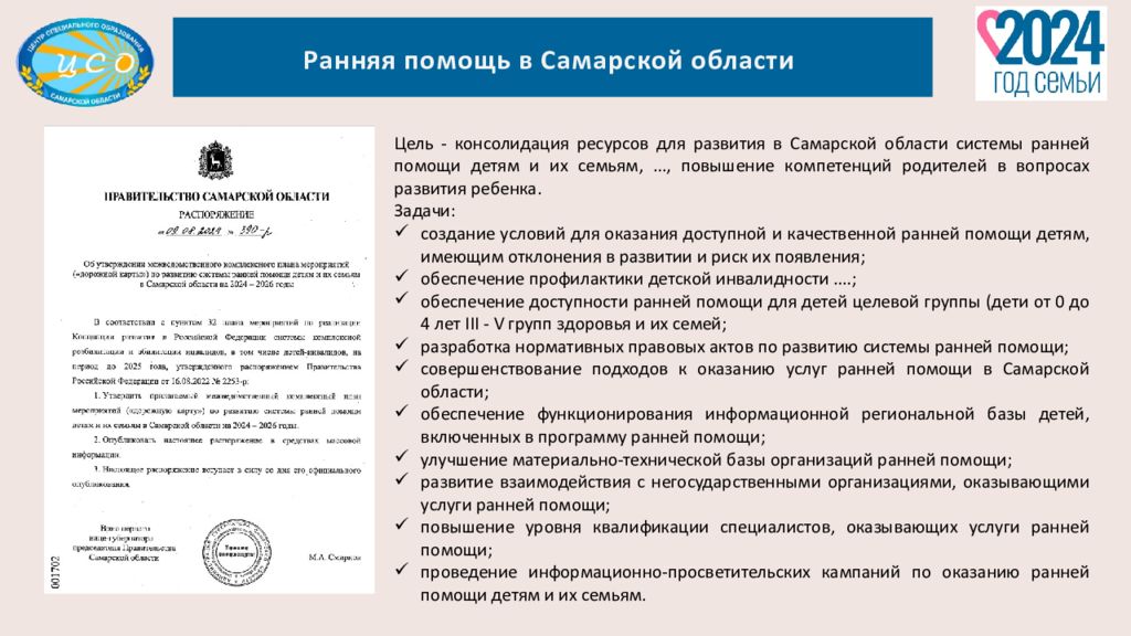 Ранняя помощь в Самарской области Цель - консолидация ресурсов для развития в Самарской области системы ранней помощи детям и их семьям, …, повышение компетенций родителей в вопросах развития ребенка. Задачи: создание условий для оказания доступной и качественной ранней помощи детям, имеющим отклонения в развитии и риск их появления; обеспечение профилактики детской инвалидности ….; обеспечение доступности ранней помощи для детей целевой группы (дети от 0 до 4 лет III - V групп здоровья и их семей; разработка нормативных правовых актов по развитию системы ранней помощи; совершенствование подходов к оказанию услуг ранней помощи в Самарской области; обеспечение функционирования информационной региональной базы детей, включенных в программу ранней помощи; улучшение материально-технической базы организаций ранней помощи; развитие взаимодействия с негосударственными организациями, оказывающими услуги ранней помощи; повышение уровня квалификации специалистов, оказывающих услуги ранней помощи; проведение информационно-просветительских кампаний по оказанию ранней помощи детям и их семьям.