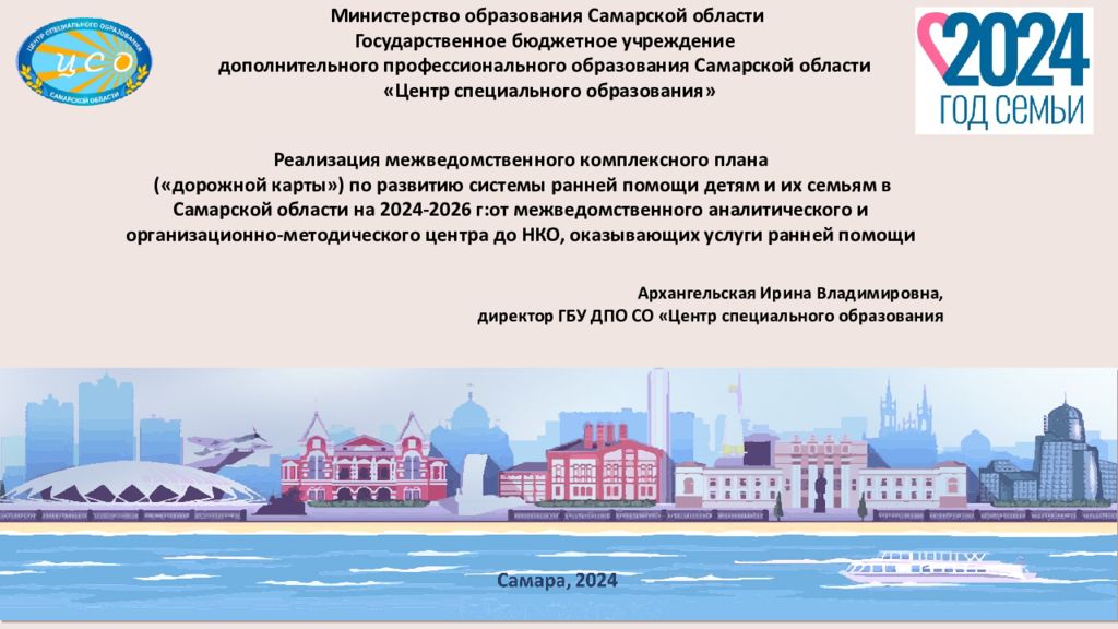 Архангельская Ирина Владимировна, директор ГБУ ДПО СО «Центр специального образования Министерство образования Самарской области Государственное бюджетное учреждение дополнительного профессионального образования Самарской области «Центр специального образования» Реализация межведомственного комплексного плана («дорожной карты») по развитию системы ранней помощи детям и их семьям в Самарской области на 2024-2026 г:от межведомственного аналитического и организационно-методического центра до НКО, оказывающих услуги ранней помощи
