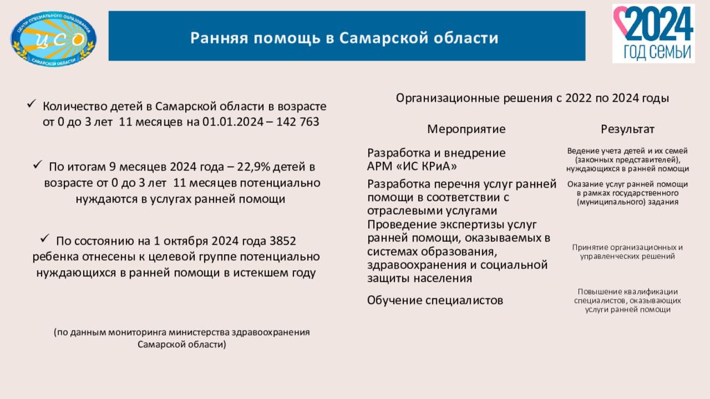 Ранняя помощь в Самарской области Мероприятие Результат Разработка и внедрение АРМ «ИС КРиА » Ведение учета детей и их семей (законных представителей), нуждающихся в ранней помощи Разработка перечня услуг ранней помощи в соответствии с отраслевыми услугами Оказание услуг ранней помощи в рамках государственного (муниципального) задания Проведение экспертизы услуг ранней помощи, оказываемых в системах образования, здравоохранения и социальной защиты населения Принятие организационных и управленческих решений Обучение специалистов Повышение квалификации специалистов, оказывающих услуги ранней помощи Организационные решения с 2022 по 2024 годы П о итогам 9 месяцев 2024 года – 22,9% детей в возрасте от 0 до 3 лет 11 месяцев потенциально нуждаются в услугах ранней помощи Количество детей в Самарской области в возрасте от 0 до 3 лет 11 месяцев на 01.01.2024 – 142 763 По состоянию на 1 октября 2024 года 3852 ребенка отнесены к целевой группе потенциально нуждающихся в ранней помощи в истекшем году (по данным мониторинга министерства здравоохранения Самарской области)