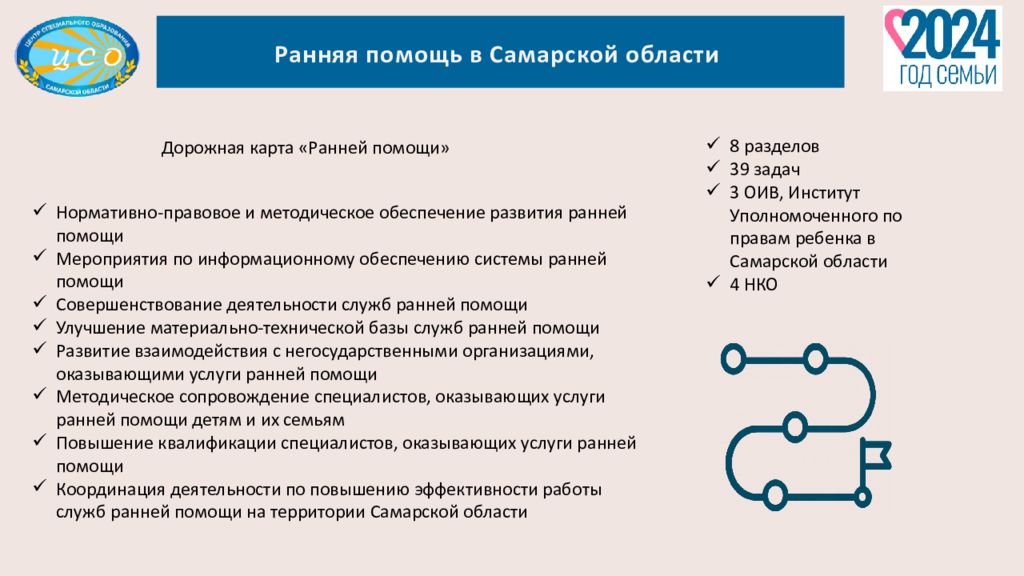 Ранняя помощь в Самарской области Дорожная карта «Ранней помощи» 8 разделов 39 задач 3 ОИВ, Институт Уполномоченного по правам ребенка в Самарской области 4 НКО Нормативно-правовое и методическое обеспечение развития ранней помощи Мероприятия по информационному обеспечению системы ранней помощи Совершенствование деятельности служб ранней помощи Улучшение материально-технической базы служб ранней помощи Развитие взаимодействия с негосударственными организациями, оказывающими услуги ранней помощи Методическое сопровождение специалистов, оказывающих услуги ранней помощи детям и их семьям Повышение квалификации специалистов, оказывающих услуги ранней помощи Координация деятельности по повышению эффективности работы служб ранней помощи на территории Самарской области
