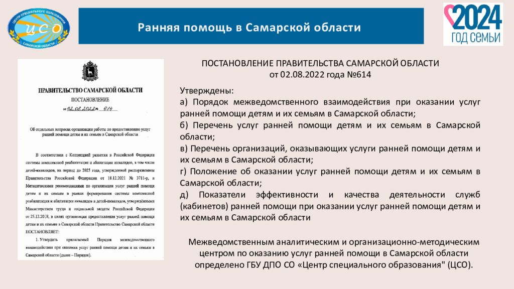 Ранняя помощь в Самарской области Утверждены: а) Порядок межведомственного взаимодействия при оказании услуг ранней помощи детям и их семьям в Самарской области; б) Перечень услуг ранней помощи детям и их семьям в Самарской области; в ) Перечень организаций, оказывающих услуги ранней помощи детям и их семьям в Самарской области ; г) Положение об оказании услуг ранней помощи детям и их семьям в Самарской области ; д ) Показатели эффективности и качества деятельности служб (кабинетов) ранней помощи при оказании услуг ранней помощи детям и их семьям в Самарской области ПОСТАНОВЛЕНИЕ ПРАВИТЕЛЬСТВА САМАРСКОЙ ОБЛАСТИ от 02.08.2022 года № 614 Межведомственным аналитическим и организационно-методическим центром по оказанию услуг ранней помощи в Самарской области определено ГБУ ДПО СО «Центр специального образования" (ЦСО ).
