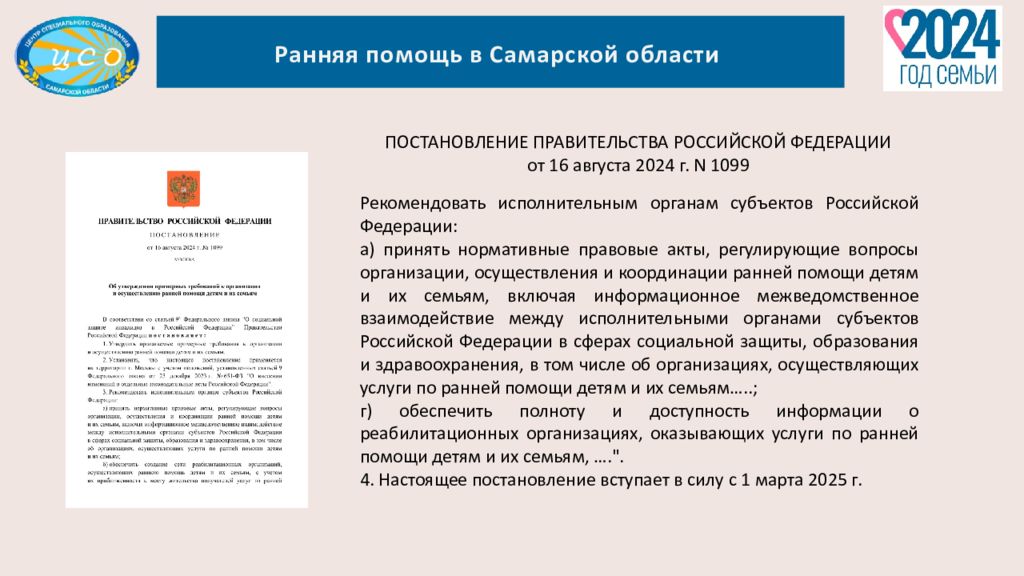 Ранняя помощь в Самарской области Рекомендовать исполнительным органам субъектов Российской Федерации: а) принять нормативные правовые акты, регулирующие вопросы организации, осуществления и координации ранней помощи детям и их семьям, включая информационное межведомственное взаимодействие между исполнительными органами субъектов Российской Федерации в сферах социальной защиты, образования и здравоохранения, в том числе об организациях, осуществляющих услуги по ранней помощи детям и их семьям…..; г ) обеспечить полноту и доступность информации о реабилитационных организациях, оказывающих услуги по ранней помощи детям и их семьям, ….". 4. Настоящее постановление вступает в силу с 1 марта 2025 г. ПОСТАНОВЛЕНИЕ ПРАВИТЕЛЬСТВА РОССИЙСКОЙ ФЕДЕРАЦИИ от 16 августа 2024 г. N 1099