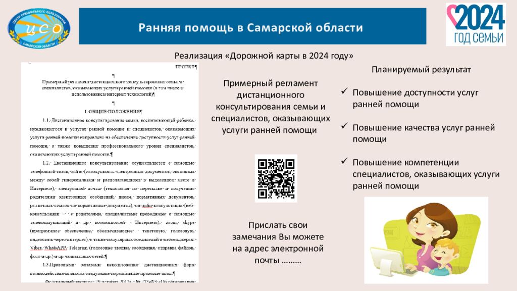 Ранняя помощь в Самарской области Реализация «Дорожной карты в 2024 году» Планируемый результат Повышение доступности услуг ранней помощи Повышение качества услуг ранней помощи Повышение компетенции специалистов, оказывающих услуги ранней помощи Прислать свои замечания Вы можете на адрес электронной почты ……… Примерный регламент дистанционного консультирования семьи и специалистов, оказывающих услуги ранней помощи