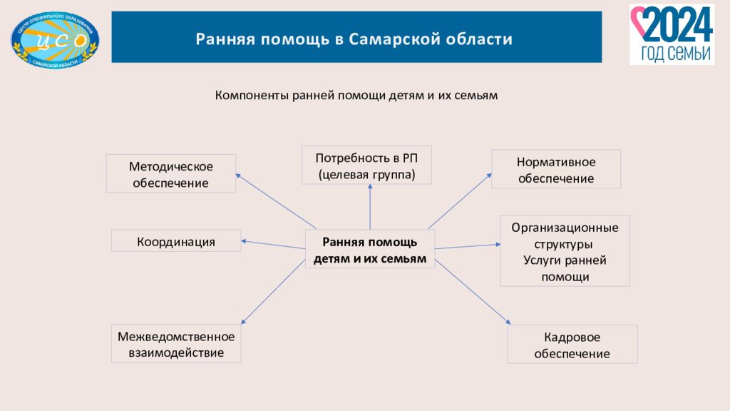 Ранняя помощь в Самарской области Ранняя помощь детям и их семьям Потребность в РП (целевая группа) Нормативное обеспечение Организационные структуры Услуги ранней помощи Кадровое обеспечение Координация Межведомственное взаимодействие Методическое обеспечение Компоненты ранней помощи детям и их семьям