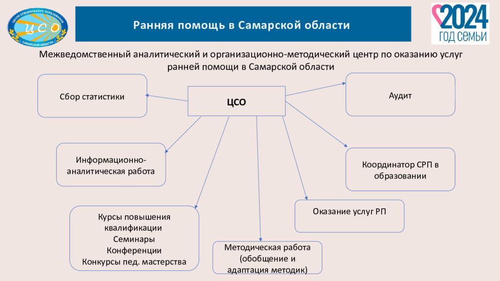 Ранняя помощь в Самарской области ЦСО Оказание услуг РП Курсы повышения квалификации Семинары Конференции Конкурсы пед. мастерства Информационно-аналитическая работа Координатор СРП в образовании Методическая работа (обобщение и адаптация методик) Сбор статистики Аудит Межведомственный аналитический и организационно-методический центр по оказанию услуг ранней помощи в Самарской области