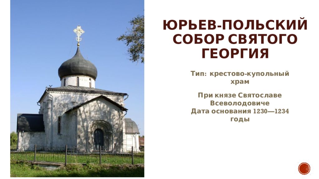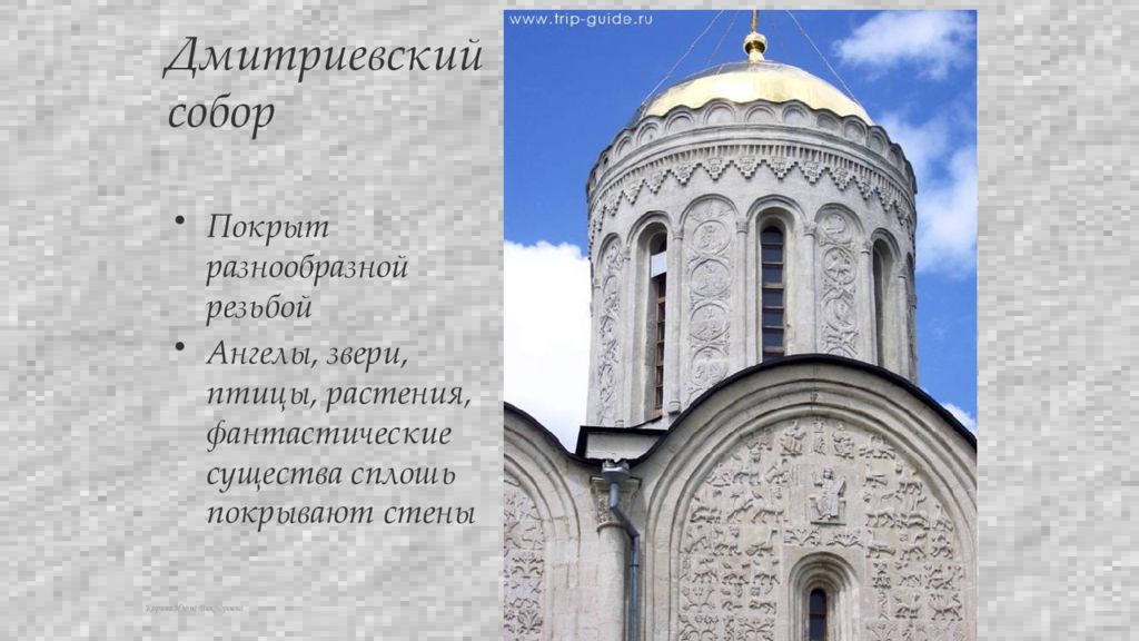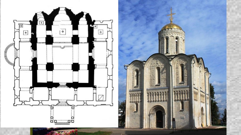 Корина Илона Викторовна Дмитриевский собор во Владимире 1194-1197гг во имя святого Дмитрия Солунского по приказу Всеволода Большое Гнездо, в крещении Дмитрия Одноглавый, 4х-столпный княжеский храм невелик, не слишком вместителен