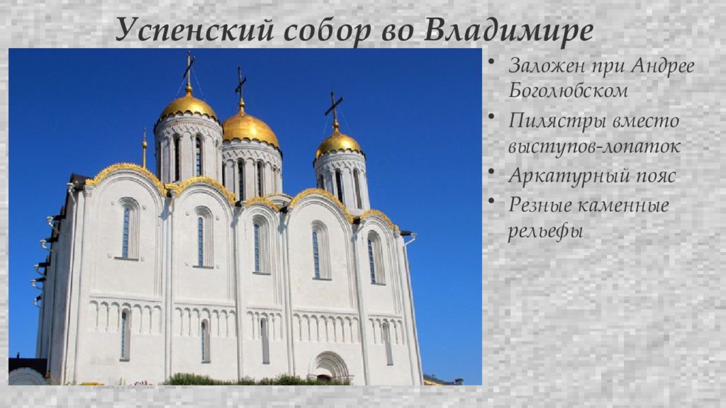 Корина Илона Викторовна Успенский собор во Владимире Заложен при Андрее Боголюбском Пилястры вместо выступов-лопаток Аркатурный пояс Резные каменные рельефы