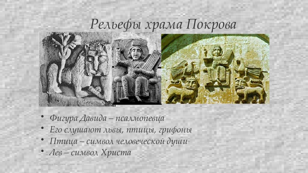 Корина Илона Викторовна Рельефы храма Покрова Фигура Давида – псалмопевца Его слушают львы, птицы, грифоны Птица – символ человеческой души Лев – символ Христа