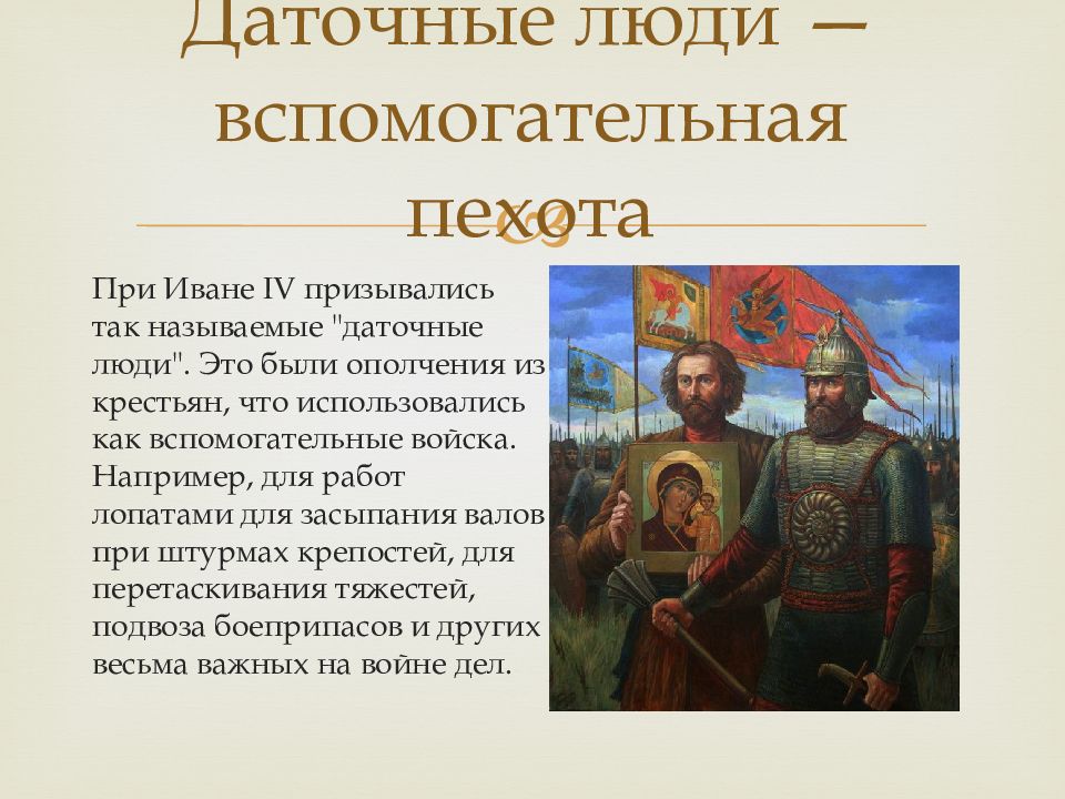 При Иване IV призывались так называемые "даточные люди". Это были ополчения из крестьян, что использовались как вспомогательные войска. Например, для работ лопатами для засыпания валов при штурмах крепостей, для перетаскивания тяжестей, подвоза боеприпасов и других весьма важных на войне дел. Даточные люди — вспомогательная пехота