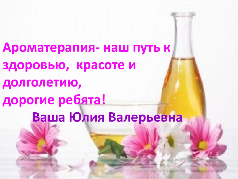 Слайд 16: Ароматерапия- наш путь к здоровью, красоте и долголетию, дорогие ребята! Ваша Юлия Валерьевна