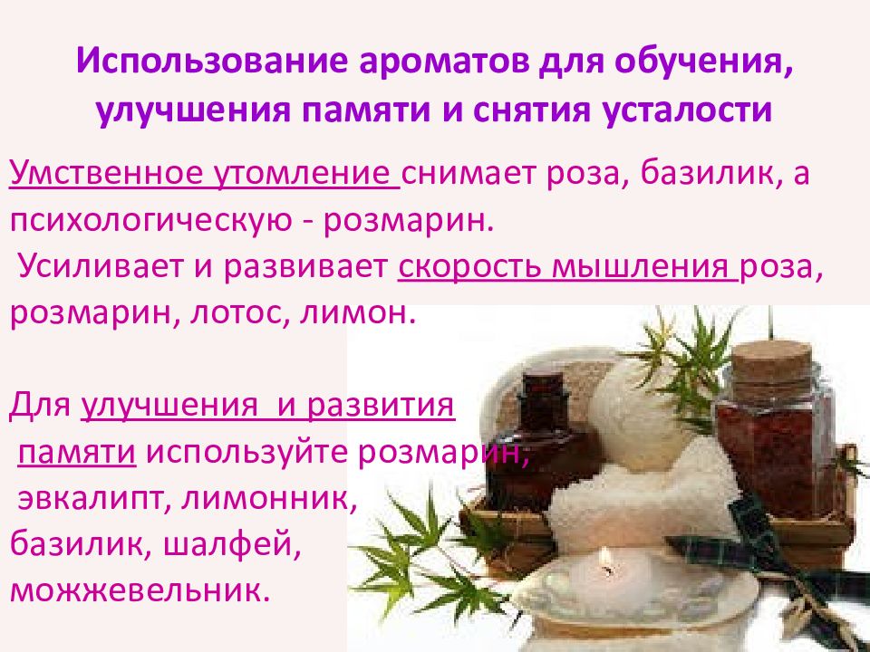 Умственное утомление снимает роза, базилик, а психологическую - розмарин. Усиливает и развивает скорость мышления роза, розмарин, лотос, лимон. Для улучшения и развития памяти используйте розмарин, эвкалипт, лимонник, базилик, шалфей, можжевельник.