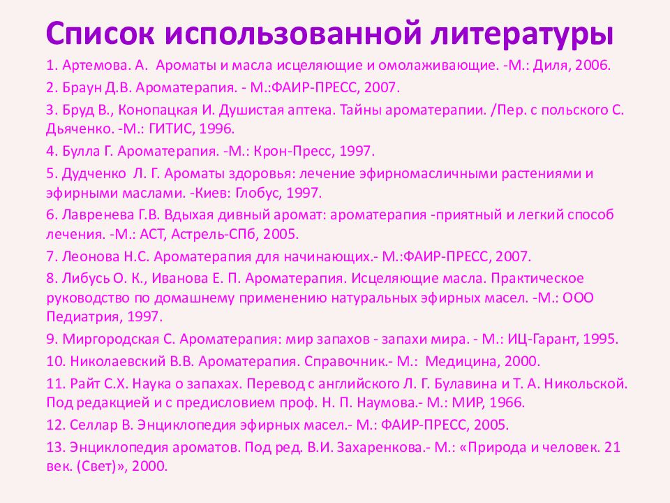 Последний слайд презентации: Ароматерапия для нас, друзья!: Список использованной литературы