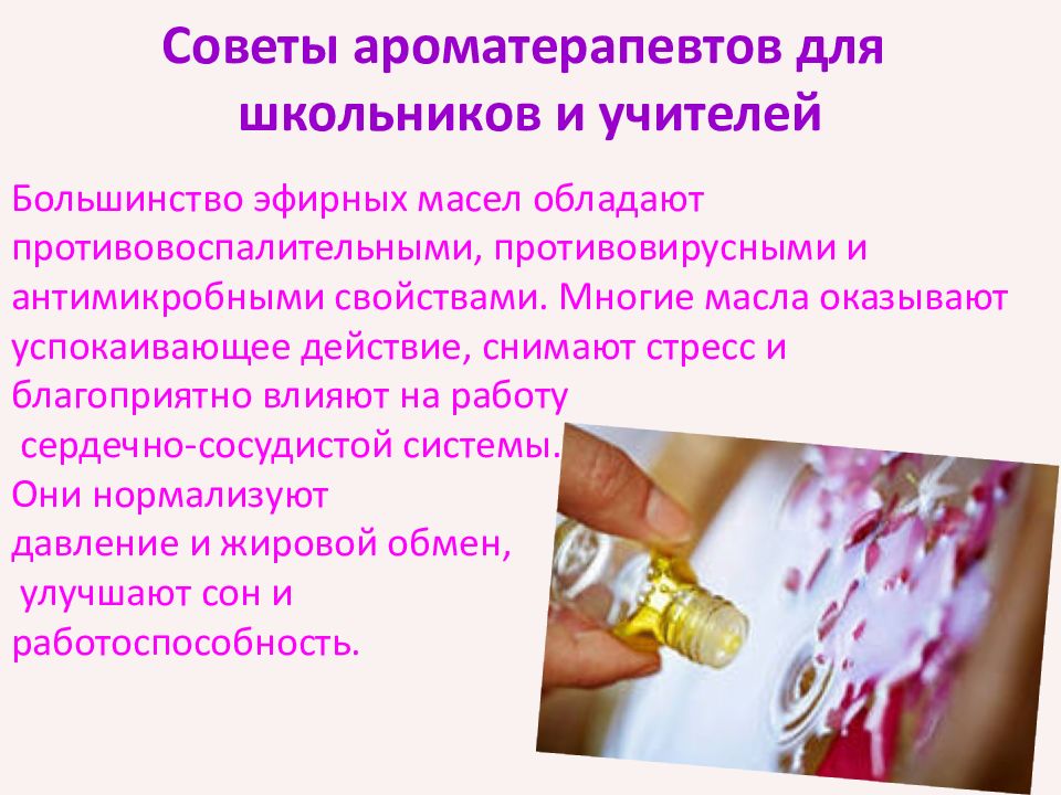 Большинство эфирных масел обладают противовоспалительными, противовирусными и антимикробными свойствами. Многие масла оказывают успокаивающее действие, снимают стресс и благоприятно влияют на работу сердечно-сосудистой системы. Они нормализуют давление и жировой обмен, улучшают сон и работоспособность. Советы ароматерапевтов для школьников и учителей