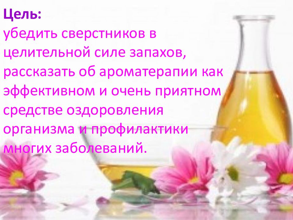 Слайд 2: Цель: убедить сверстников в целительной силе запахов, рассказать об ароматерапии как эффективном и очень приятном средстве оздоровления организма и профилактики многих заболеваний