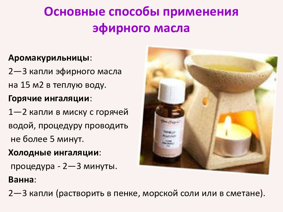 Слайд 15: Основные способы применения эфирного масла