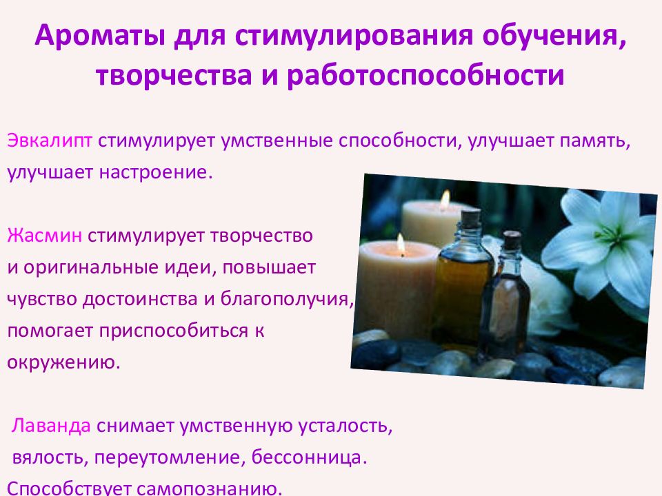 Эвкалипт стимулирует умственные способности, улучшает память, улучшает настроение. Жасмин стимулирует творчество и оригинальные идеи, повышает чувство достоинства и благополучия, помогает приспособиться к окружению. Лаванда снимает умственную усталость, вялость, переутомление, бессонница. Способствует самопознанию. Ароматы для стимулирования обучения, творчества и работоспособности