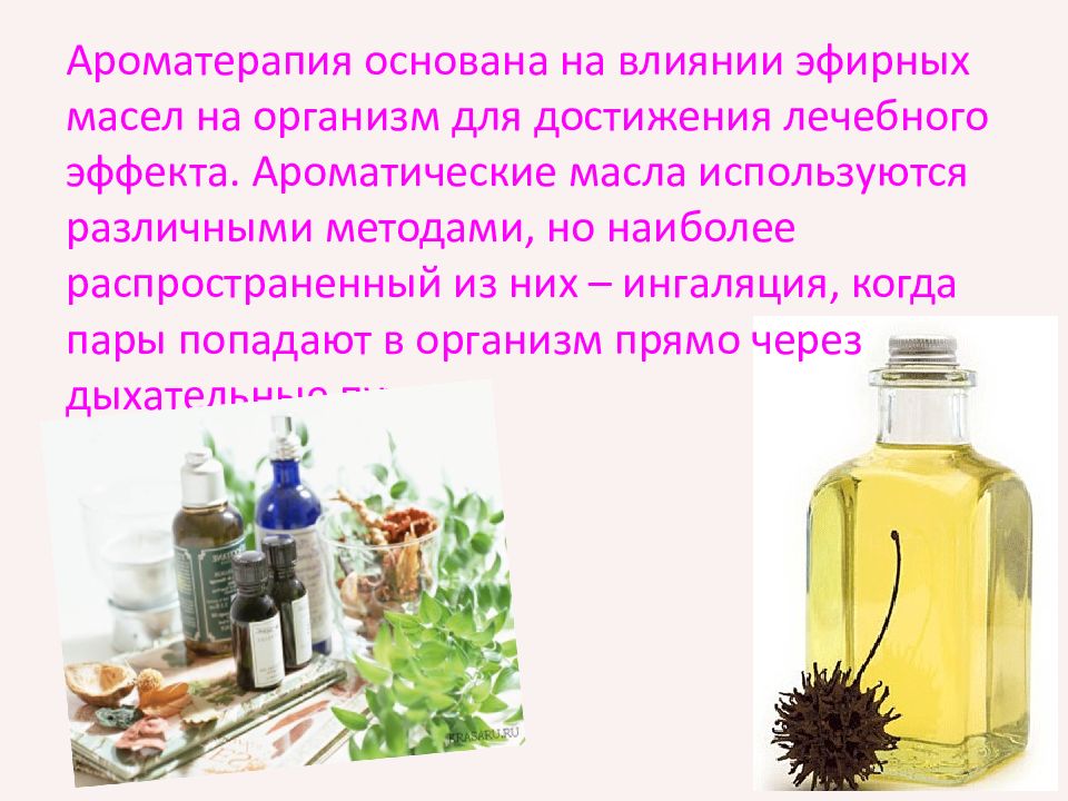 Ароматерапия основана на влиянии эфирных масел на организм для достижения лечебного эффекта. Ароматические масла используются различными методами, но наиболее распространенный из них – ингаляция, когда пары попадают в организм прямо через дыхательные пути.