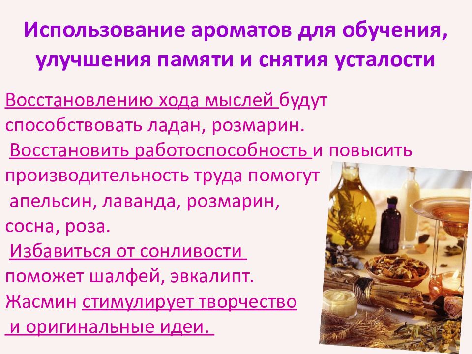 Слайд 10: Ароматы для стимулирования обучения, творчества и работоспособности