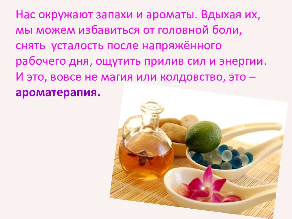 Нас окружают запахи и ароматы. Вдыхая их, мы можем избавиться от головной боли, снять усталость после напряжённого рабочего дня, ощутить прилив сил и энергии. И это, вовсе не магия или колдовство, это – ароматерапия.