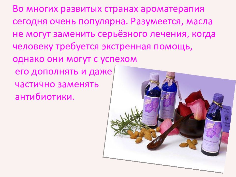 Во многих развитых странах ароматерапия сегодня очень популярна. Разумеется, масла не могут заменить серьёзного лечения, когда человеку требуется экстренная помощь, однако они могут с успехом его дополнять и даже частично заменять антибиотики.