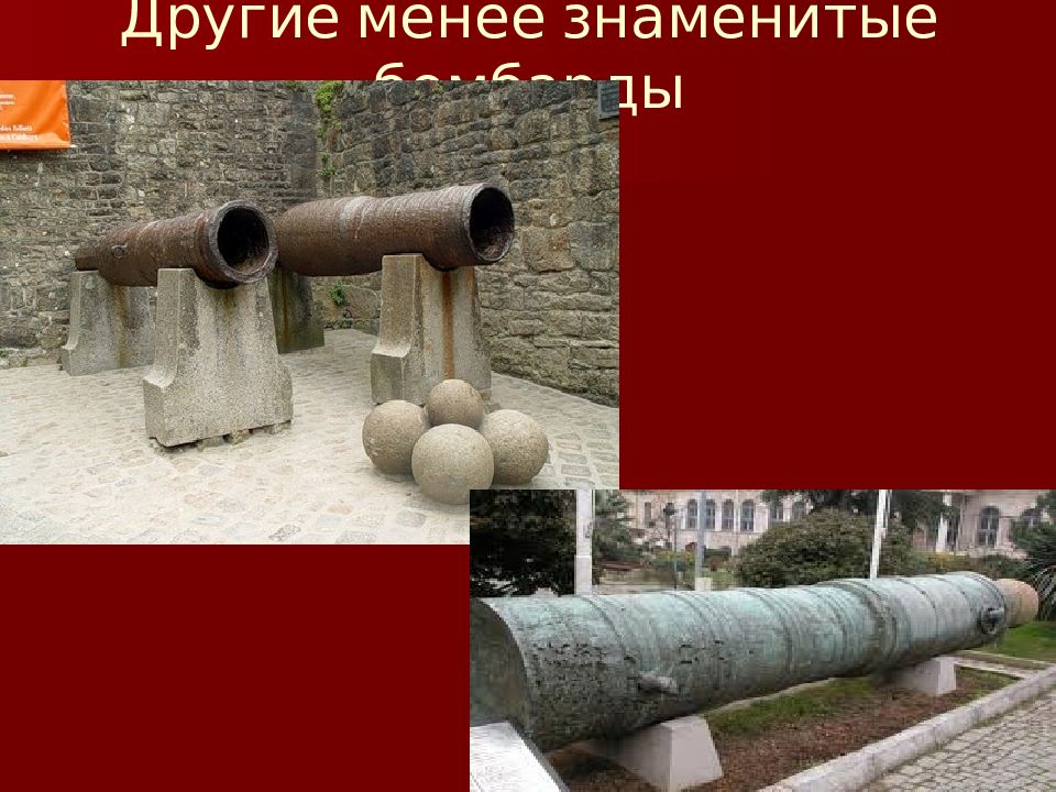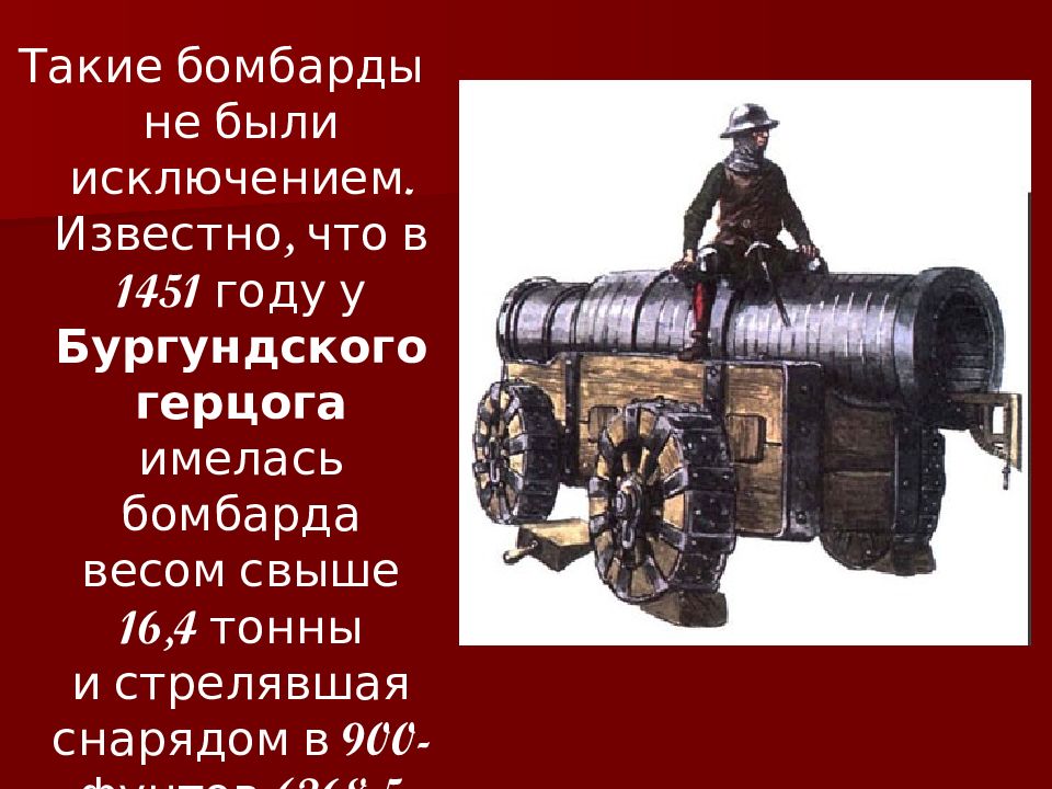 Такие бомбарды не были исключением. Известно, что в 1451 году у Бургундского герцога имелась бомбарда весом свыше 16,4 тонны и стрелявшая снарядом в 900-фунтов (368,5 кг).