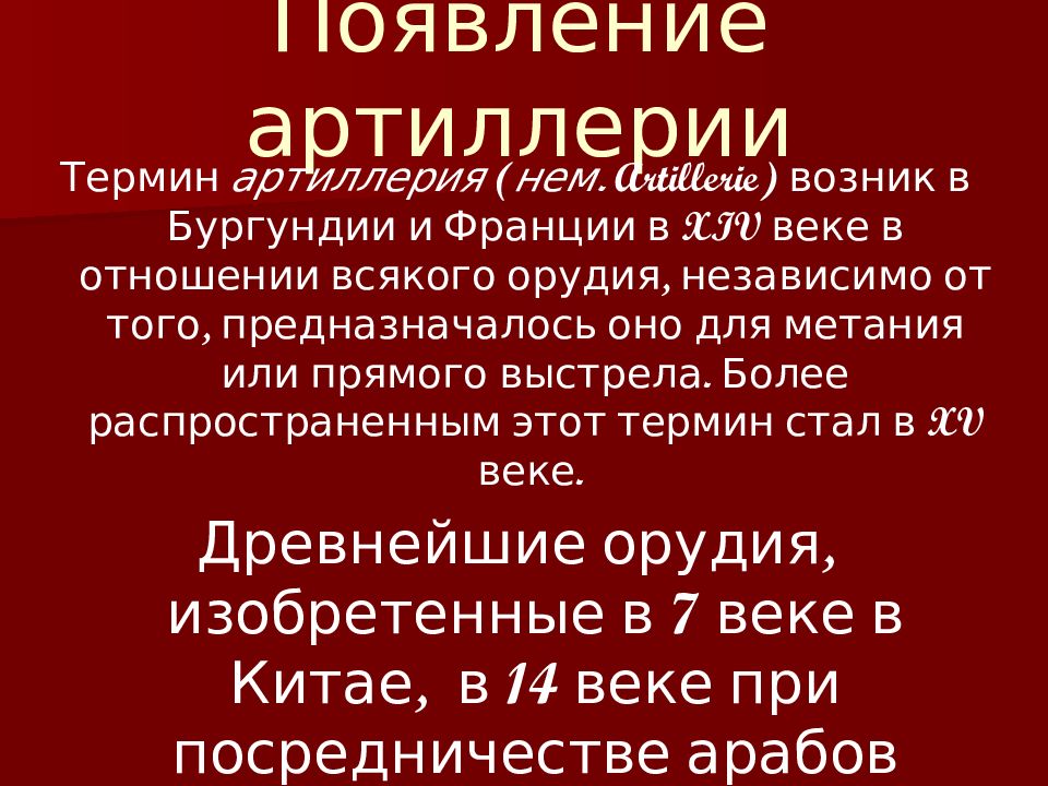 Термин артиллерия ( нем. Artillerie) возник в Бургундии и Франции в XIV веке в отношении всякого орудия, независимо от того, предназначалось оно для метания или прямого выстрела. Более распространенным этот термин стал в XV веке. Древнейшие орудия, изобретенные в 7 веке в Китае, в 14 веке при посредничестве арабов попали и в Европу.