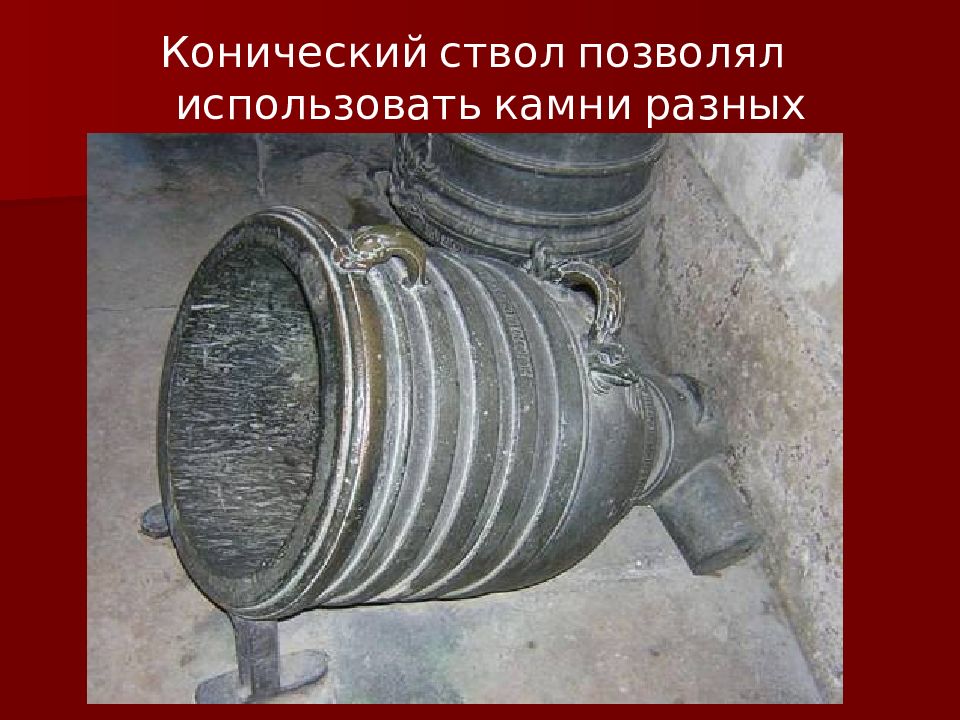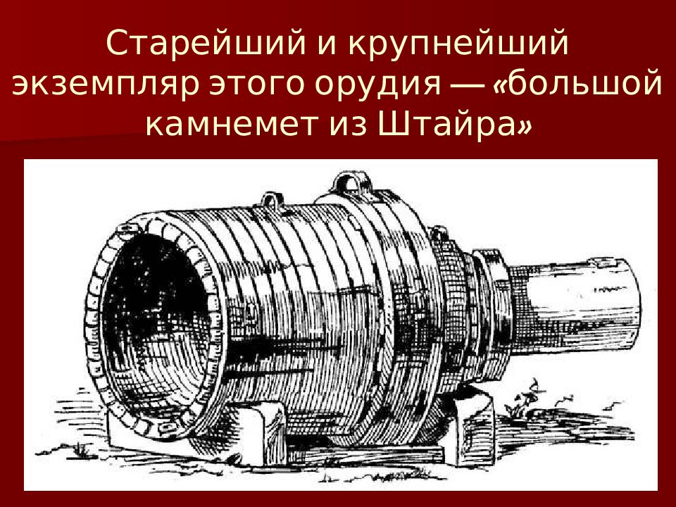 Слайд 29: Старейший и крупнейший экземпляр этого орудия — «большой камнемет из Штайра»