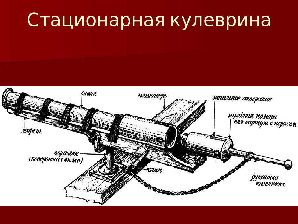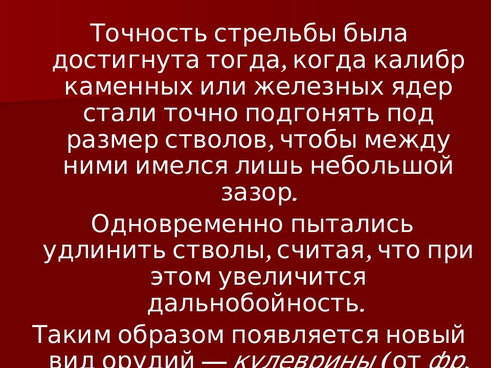 Точность стрельбы была достигнута тогда, когда калибр каменных или железных ядер стали точно подгонять под размер стволов, чтобы между ними имелся лишь небольшой зазор. Одновременно пытались удлинить стволы, считая, что при этом увеличится дальнобойность. Таким образом появляется новый вид орудий — кулеврины (от фр. couleuvre — уж).