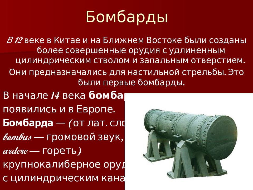 В 12 веке в Китае и на Ближнем Востоке были созданы более совершенные орудия с удлиненным цилиндрическим стволом и запальным отверстием. Они предназначались для настильной стрельбы. Это были первые бомбарды. В начале 14 века бомбарды появились и в Европе. Бомбарда — (от лат. слов bombus — громовой звук, ardere — гореть) крупнокалиберное орудия с цилиндрическим каналом. Бомбарды