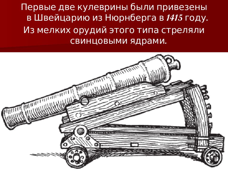 Первые две кулеврины были привезены в Швейцарию из Нюрнберга в 1415 году. Из мелких орудий этого типа стреляли свинцовыми ядрами.